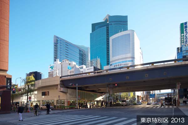 銀座8丁目付近/東京高速道路(高架橋)の向こう側は港区。汐留地区のビル群が見える。